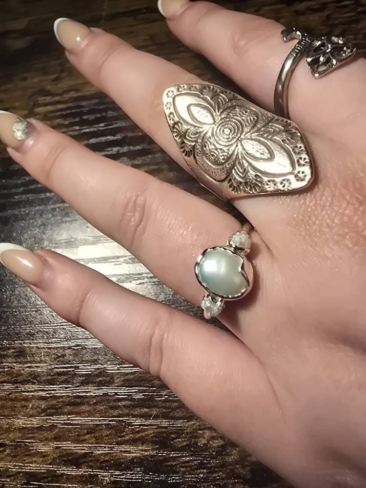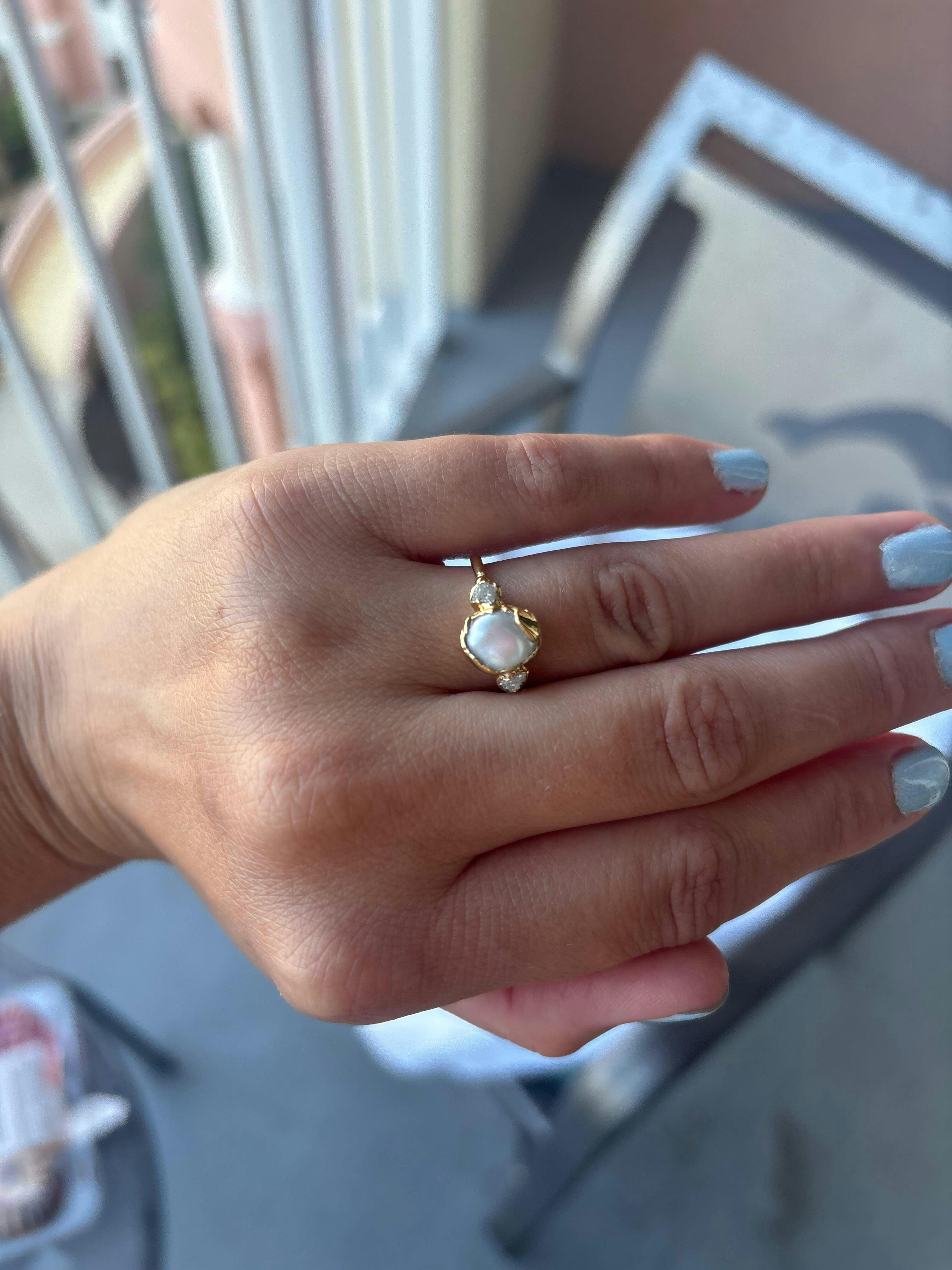 • Solitaire ring: Keshi freshwater pearl (8-10mm) and 2 conflict-free silver/white raw diamonds (3-4mm)