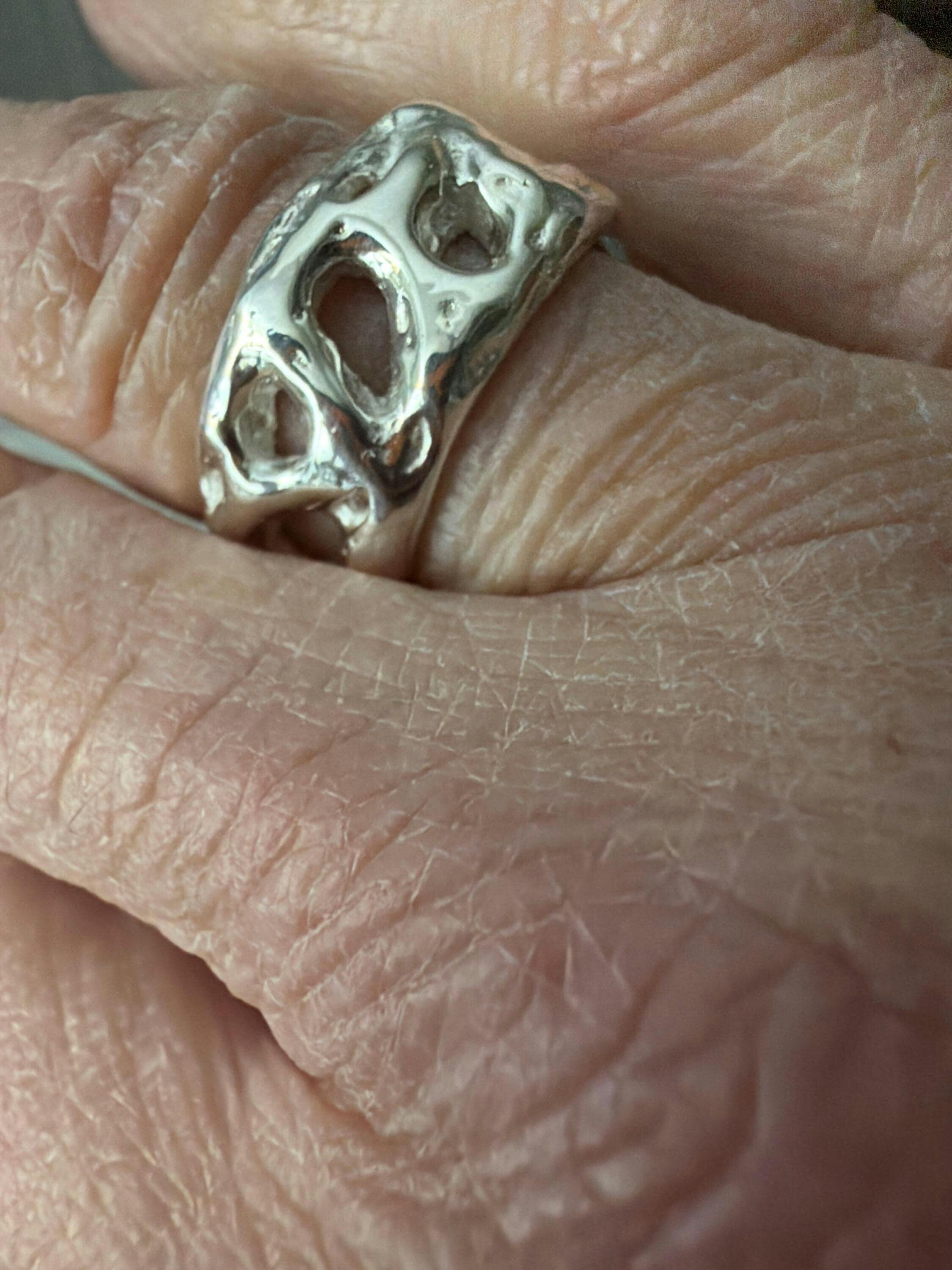 Embrace the ethereal essence of our Molten Silver Honeycomb ring - a symbol of untamed beauty and individuality. Uniquely hand-carved in wax and cast in solid silver, its irregular abstract form echoes the fluidity of liquid metal, offering a nature-inspired and imperfect touch as a stunning statement ring or a truly unique wedding band.