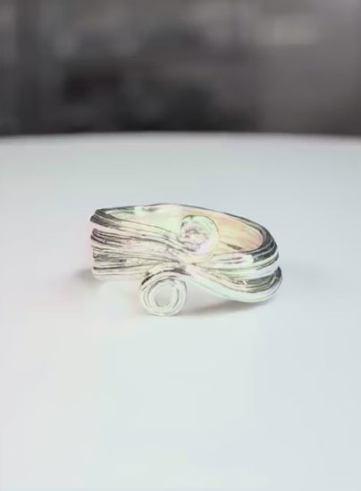 Handcrafted in solid Sterling Silver, this one-of-kind ring was handcrafted using the ancient Japanese Mitsuro Hikime wax technique, a method that allows the wax to be stretched and folded by hand - creating fluid, wood-grain-like textures that can never be exactly repeated.