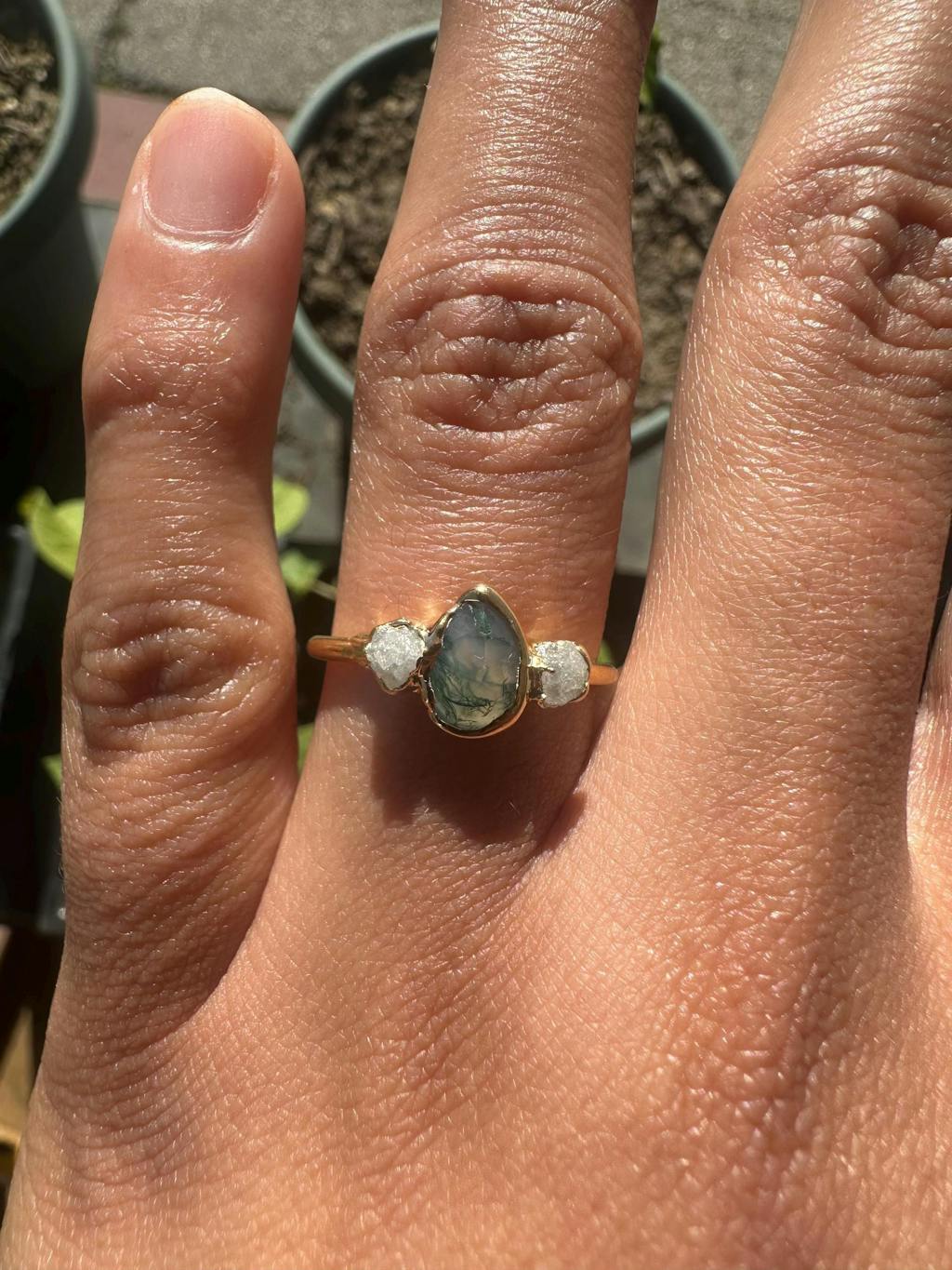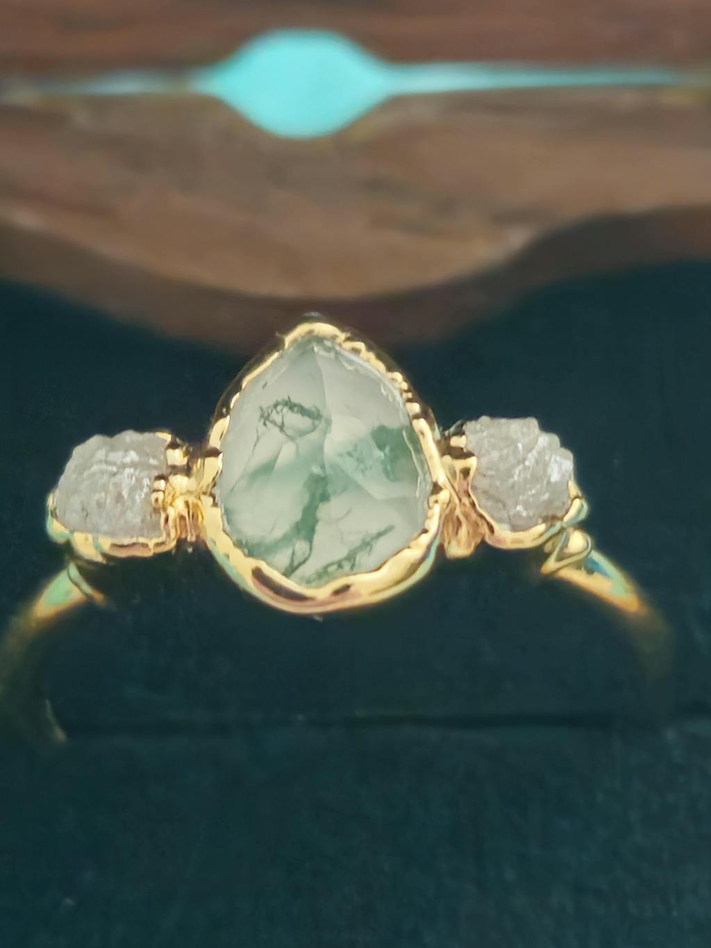 Unlock a world of timeless beauty with our Moss Agate and raw diamond engagement ring. Our Nature-inspired Engagement ring features an organic Pear-shaped Moss Agate nestled between 2 sparkly raw diamonds - uniquely set on a 14k Gold band. A one-of-a-kind rustic piece that will showcase the natural beauty of love and make a unique promise ring or engagement ring.